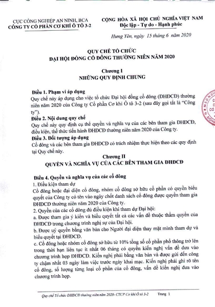 Đăng bởi CÔNG TY CỔ PHẦN CƠ KHÍ Ô TÔ 3-2 | 19/06/2020 | 0 bình luận 19/06/2020 Quy chế tổ chức ĐHĐCĐ thường niên năm 2020 Chia sẻ: